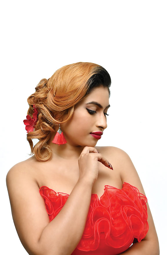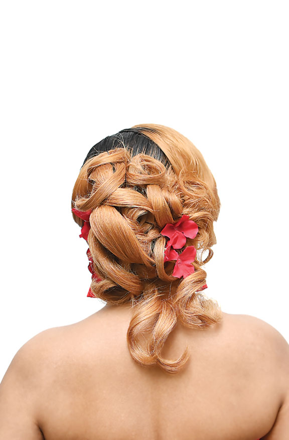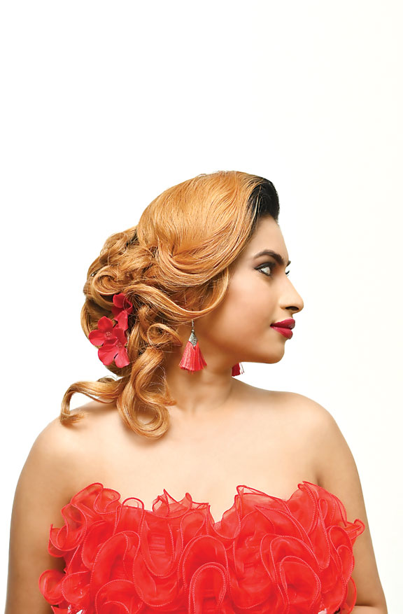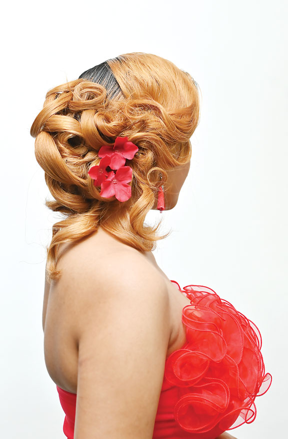 To achieve this look, the hair is first sectioned and smoothed into sleek, honey-blonde waves. Deep loops are meticulously pinned into a structured bun at the nape, while volume is created through strategic tucking. Finally, the style is secured with clips and accented by vibrant red flowers for a polished finish. The hairstyle is further embellished with vibrant red floral accessories, which have been strategically pinned into the side of the bun to complement the model’s attire. Additionally, long red tassel earrings are worn to mirror the floral details, ensuring a cohesive aesthetic.