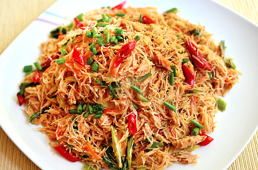 Boil three pints water and pour over the rice sticks, cover and set a side for five minutes; strain the noodles. In a wok heat oil add garlic, ginger and fry. Add marinated chicken and fry in high heat, add sauce and mix carrot, leeks and beaten eggs. Add the boiled and cooled noodles, mix well. Lastly add red chillies and spring onion leaves.